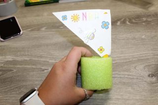 • Step 5: Thread the dowel through the sail and into the pool noodle slice.