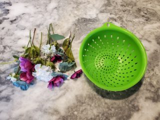 3) Give your child the artificial flowers and encourage him to place the end of the flower into the holes of the colander.