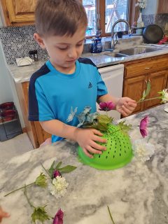 4) Extend your child’s learning by asking questions like: “What colors are you using?” “How many flowers fit into the colander?” “Can you create a pattern with the flowers?